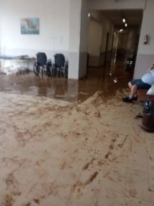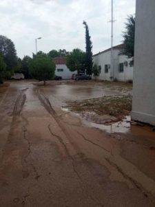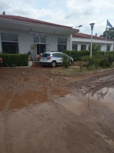 Οι εργαζόμενοι προσπαθούν ακόμη και αυτή την ώρα να απομακρύνουν τις λάσπες απο το κτήριο αφού ο Δήμος αδυνατεί να συνδράμει σε όλα τα σημεία.