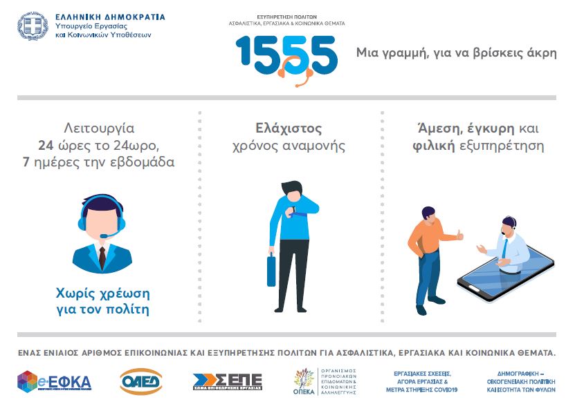 Η ενιαία γραμμή 1555 ξεκίνησε πιλοτικά τη λειτουργία της τον περασμένο Ιούλιο, με σκοπό να βελτιωθεί ουσιαστικά η εξυπηρέτηση των πολιτών και να αντιμετωπιστούν χρόνια προβλήματα στην επικοινωνία με οργανισμούς όπως ο ΕΦΚΑ. Το νέο τηλεφωνικό κέντρο ενοποιεί διάσπαρτα τηλεφωνικά κέντρα που λειτουργούσαν ως τώρα στο υπουργείο, χωρίς μεταξύ τους διασύνδεση. Οι πολίτες μπορούν να καλούν στο 1555 χωρίς χρέωση, 24 ώρες το 24ωρο και με ελάχιστο χρόνο αναμονής, για να ζητήσουν πληροφορίες, να υποβάλλουν αιτήματα και να διευθετήσουν εκκρεμείς υποθέσεις τους.