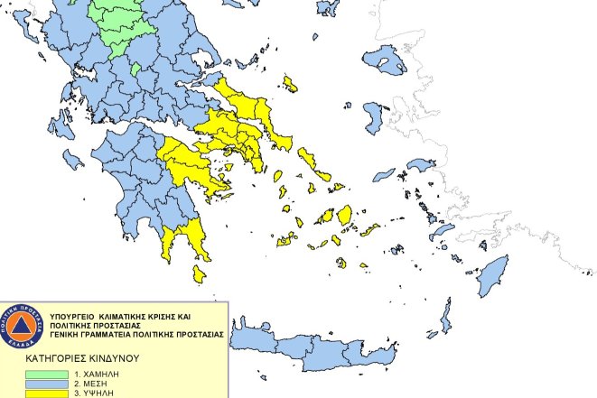 Σύμφωνα με το Χάρτη Πρόβλεψης Κινδύνου Πυρκαγιάς που εκδίδει η Γενική Γραμματεία Πολιτικής Προστασίας του Υπουργείου Κλιματικής Κρίσης & Πολιτικής Προστασίας (civilprotection.gov.gr), για σήμερα, Δευτέρα 22 Σεπτεμβρίου, προβλέπεται υψηλός κίνδυνος πυρκαγιάς (κατηγορία κινδύνου 3) για τις εξής περιοχές: