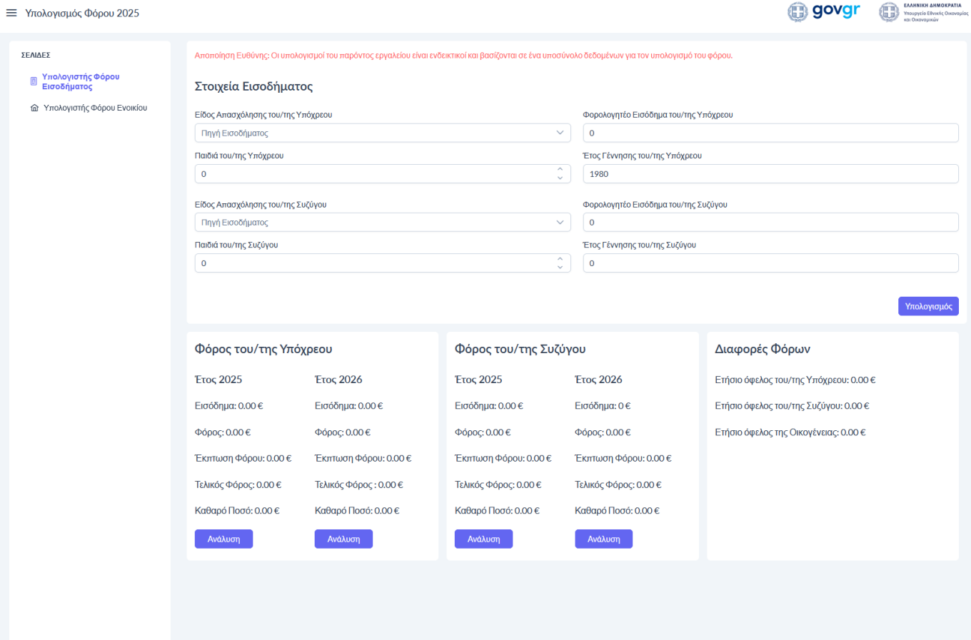 Κάθε πολίτης μπορεί να επιλέξει τον Υπολογιστή Φόρου Εισοδήματος που εμφανίζεται στην αρχική οθόνη ή τον Υπολογιστή Φόρου Ενοικίου.